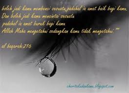 -Ingatlah hati yang terluka dan airmata yang membasahi pipi. Mutiara kedua ini lah yg selalu menjadi penemanku dikala air jernih singgah dimata. Menjadi penguat aku bhwasanya Allah itu bukan saja2 memberi aku airmata ini. Menjadikan aku mengingat kembali yang “ ada lagi manusia yg besar ujiannya lebih dari aku tetapi mereka tetap tabah dan teguh menangkis ujian yg mendatang” ya Allah…maafkan aku kerana pernah tidak seteguh mereka…